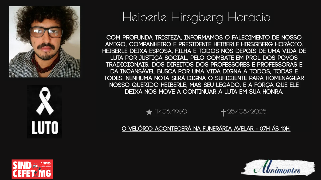 O SINDCEFET-MG presta suas condolências aos companheiros(as) da ADUNIMONTES, pelo falecimento precoce de seu presidente: Heiberle Hirsgberg Horácio , que faleceu aos 45 anos de idade neste 25 de agosto. O companheiro Heiberle destacou-se pela luta por justiça social e pelo combate em prol dos povos tradicionais e dos direitos e conquistas dos professores e […]