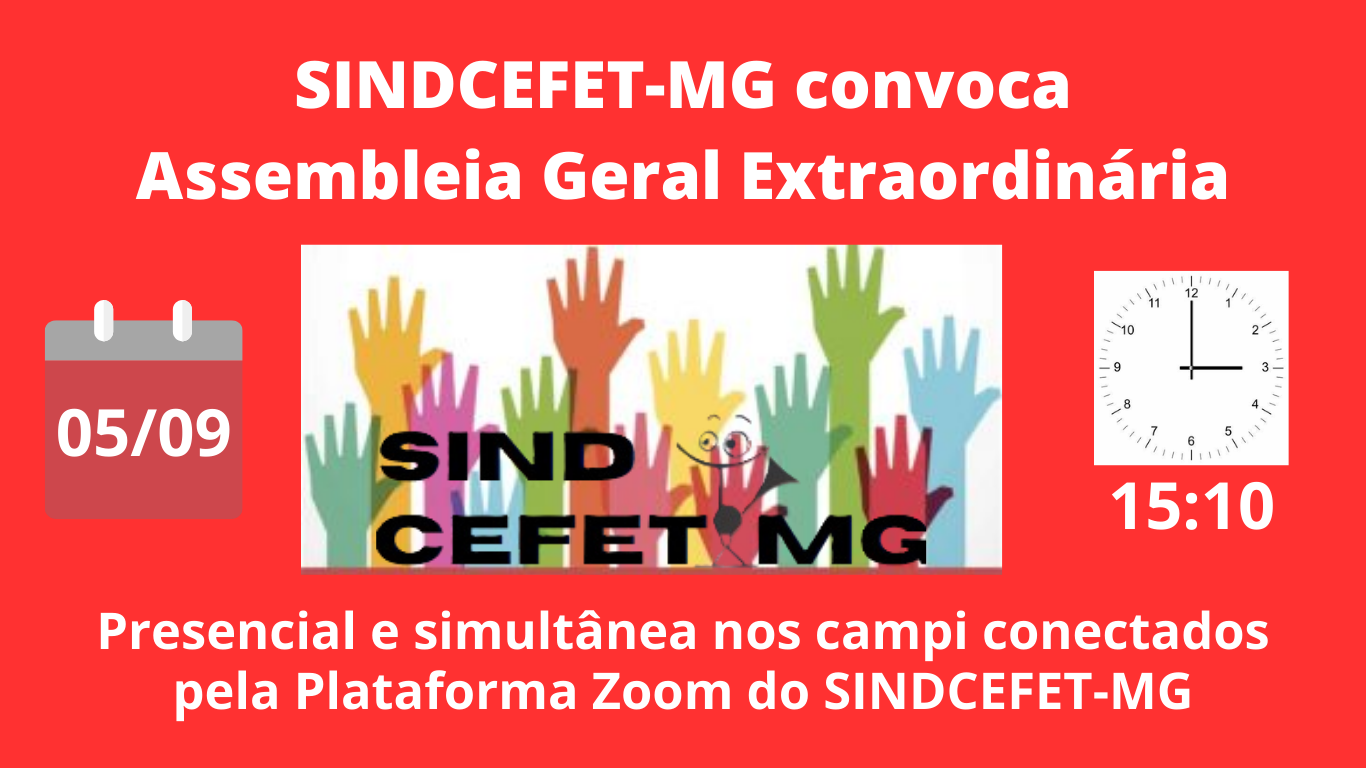 A diretoria do SINDCEFET-MG convoca o conjunto da categoria docente da instituição para a Assembleia Extraordinária. Data: 05/09/25 (sexta-feira) Horário: 15h10h Local: Presencial e simultânea nos campi, conectadas pela plataforma zoom do SINDCEFET-MG. O local em cada unidade será informado posteriormente a essa convocação. Pauta: 1- Informes; 2- Participação no ato do dia 10/09 e paralisação nacional dia […]