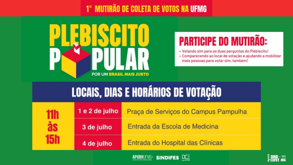 Por isso a importância da ampla participação no Plebiscito Popular, que terá início, em 1º de julho, em todos os cantos do país, incluindo a UFMG.